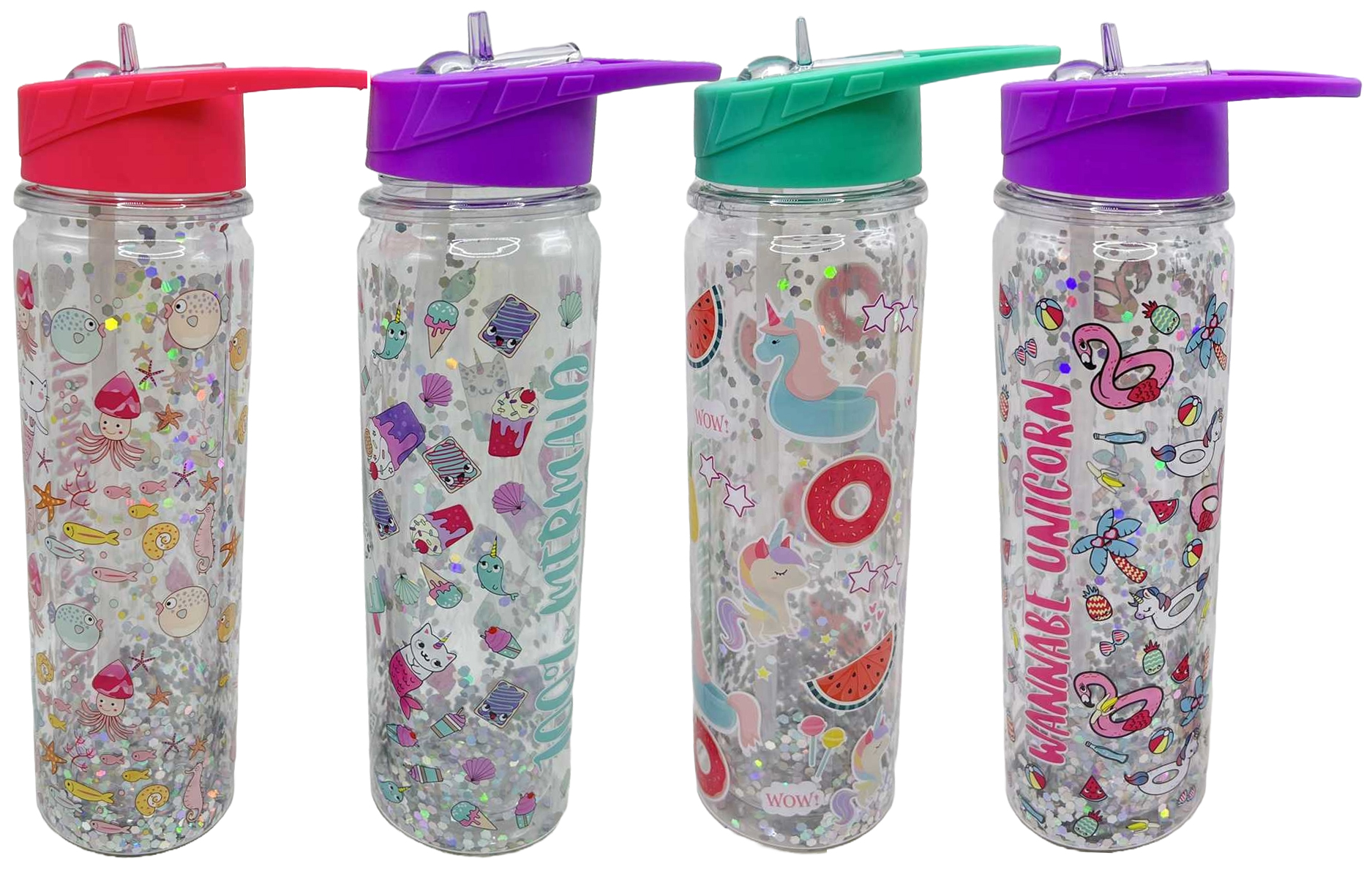 Пляшка для води з трубочкою /0380-LZ/ пластик “Коти, Єдиноріг, риби-блискітки” 550мл, мікс (1/60)